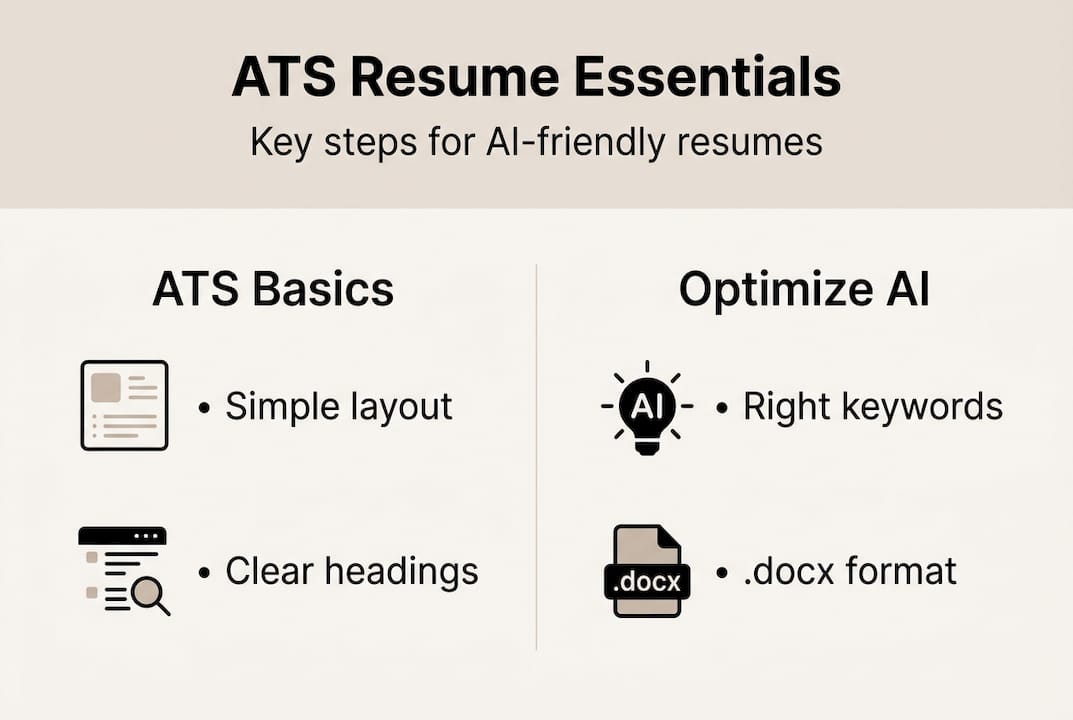 | Formatting trumps design | Avoid complex layouts, use standard fonts and headings, and save as .docx for best results. |